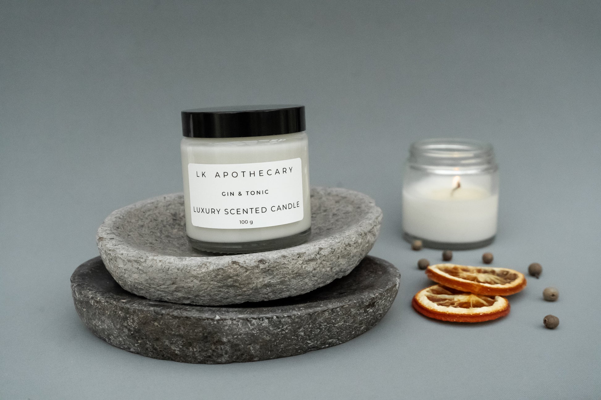 A fresh zesty aroma of gin & tonic with juniper berries and lemon, on a light floral background.