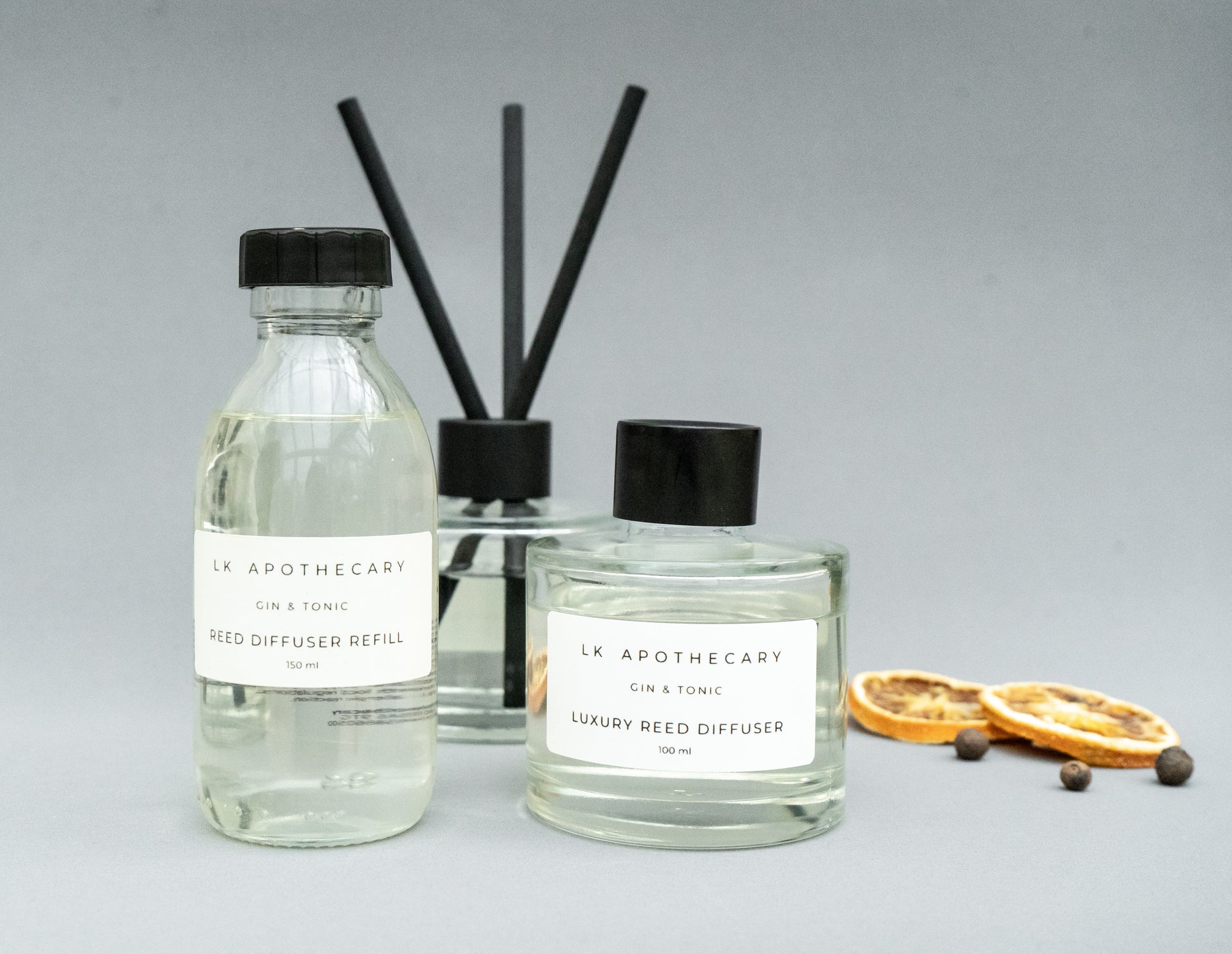 A fresh zesty aroma of gin & tonic with juniper berries and lemon, on a light floral background.